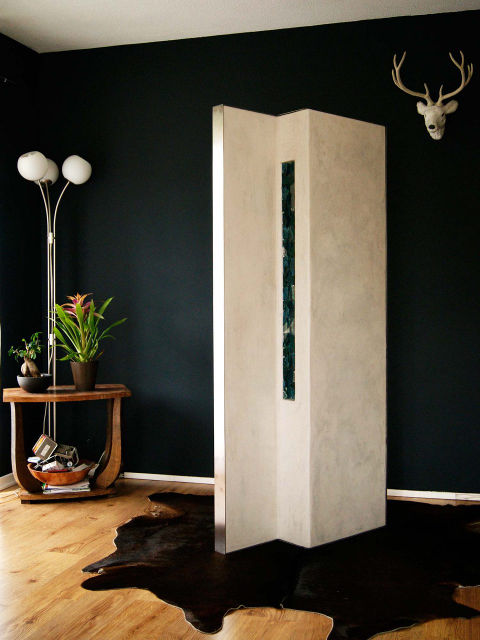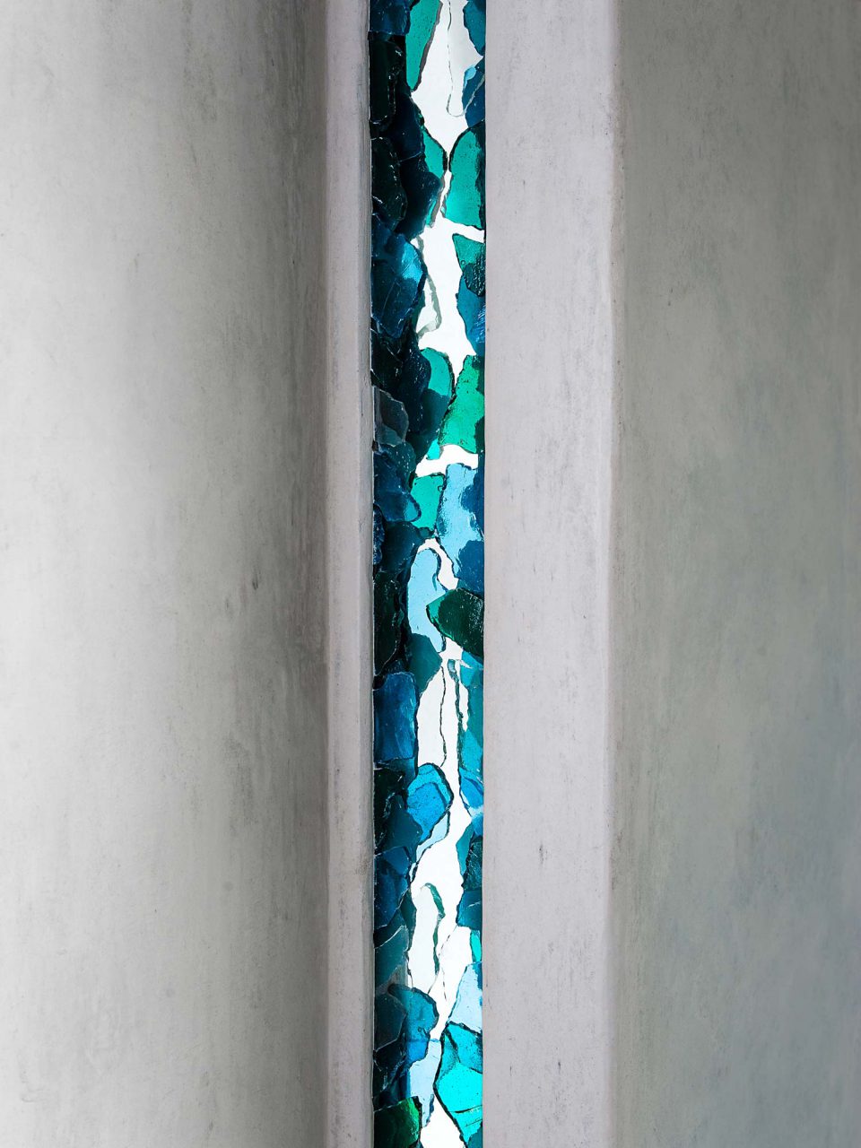This Z shaped volume induces a circulation by its salient angles which invite to discover the work of interior mosaic. The mosaic is suspended like a stained glass window revealed by the light. The surfaces made of lime ash coating offer a warm gray nuance. One side proposes a sandy surface where the light hangs and the second one allows the light to slide through a satin surface. Intervention in mosaic offers a variety of colors and patterns.
