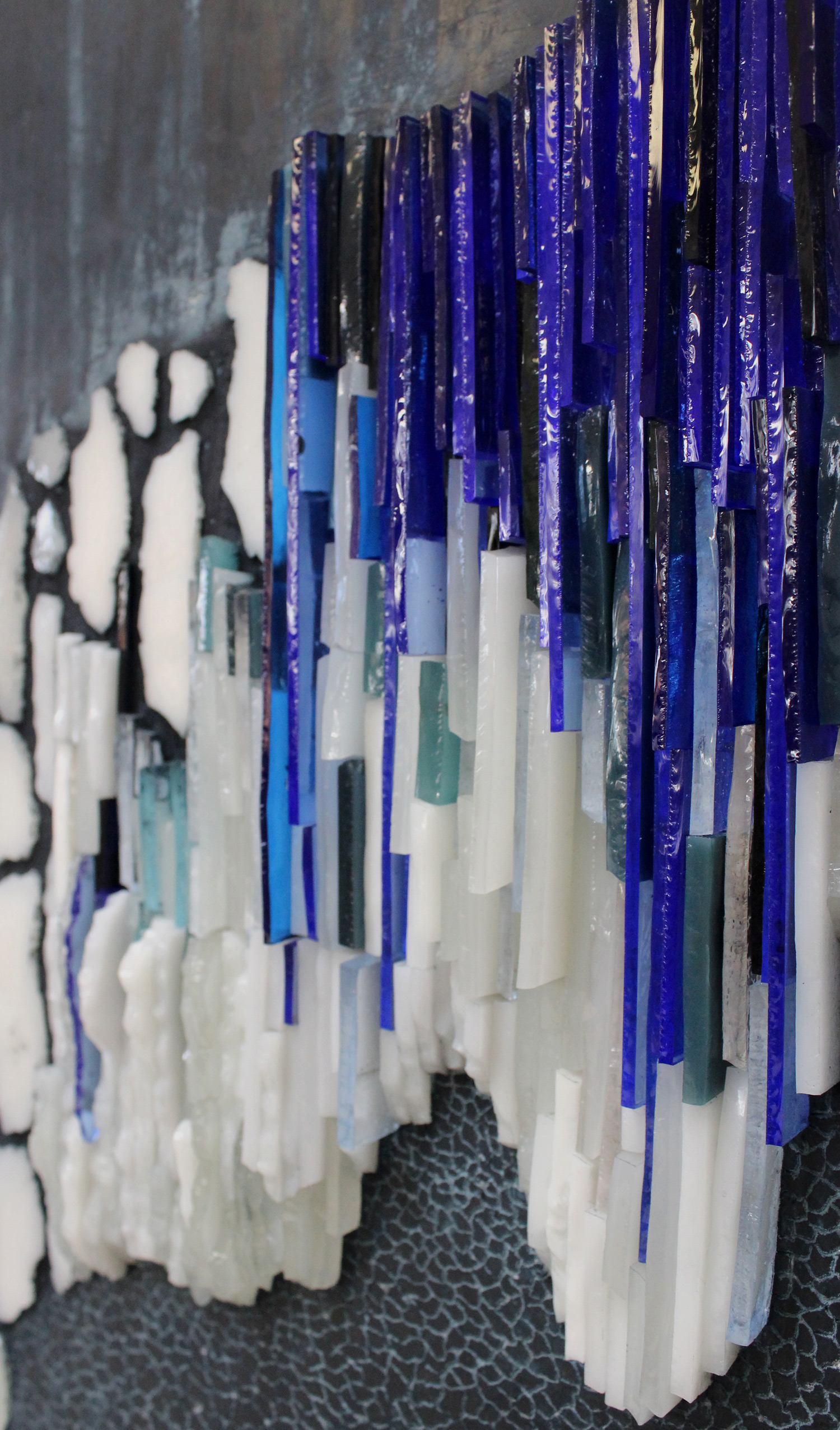 Le travail de mosaïque graphique de cette composition nous plonge dans une atmosphère aquatique ombragée. Le verre semble ruisseler sur une surface minérale rehaussée de gravure. Cette sensation se voit affirmée par un traitement de surface monochrome sur la seconde face. Son format permet de délimiter, sans cloisonner, un espace assis (salon, bureau, espace de lecture...)Tasks